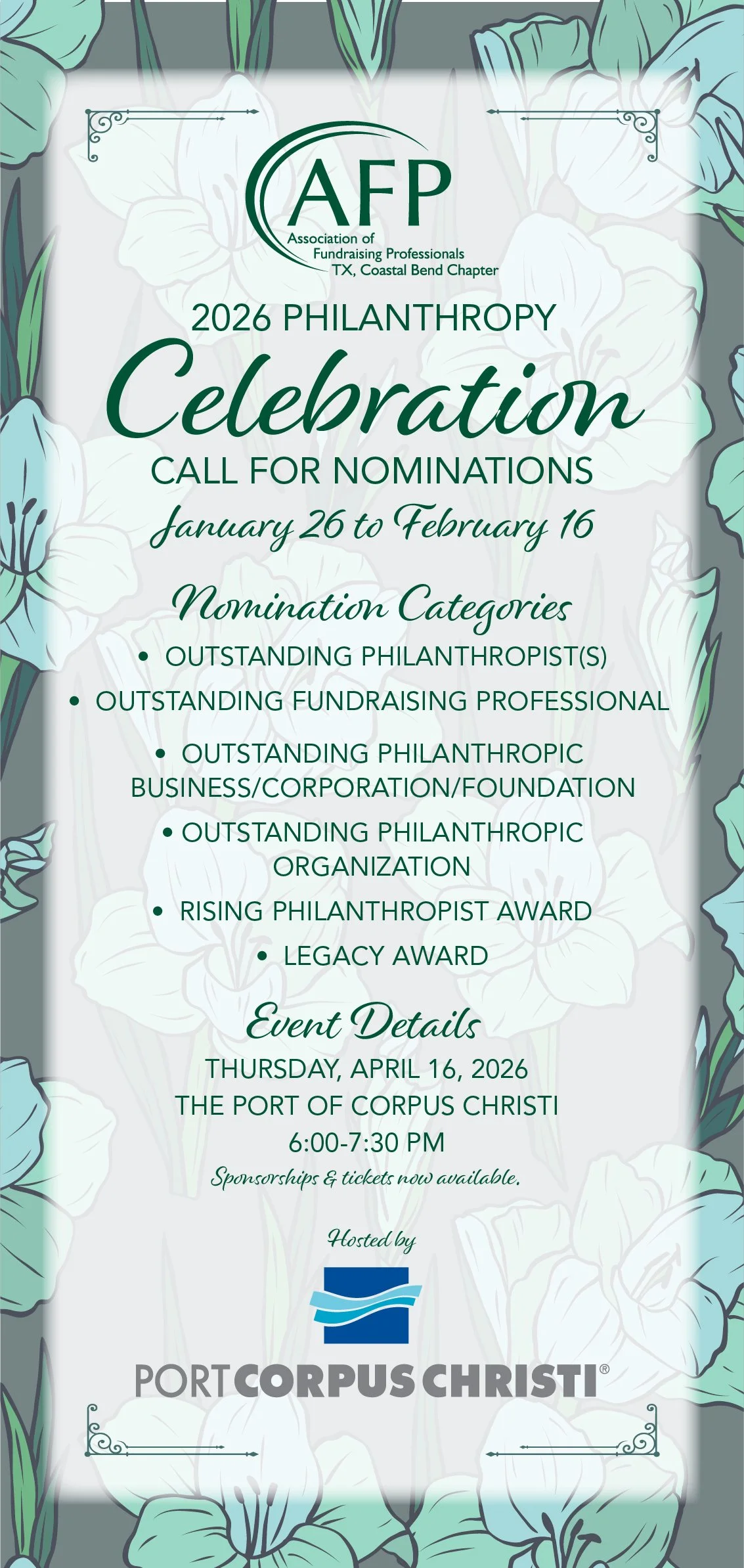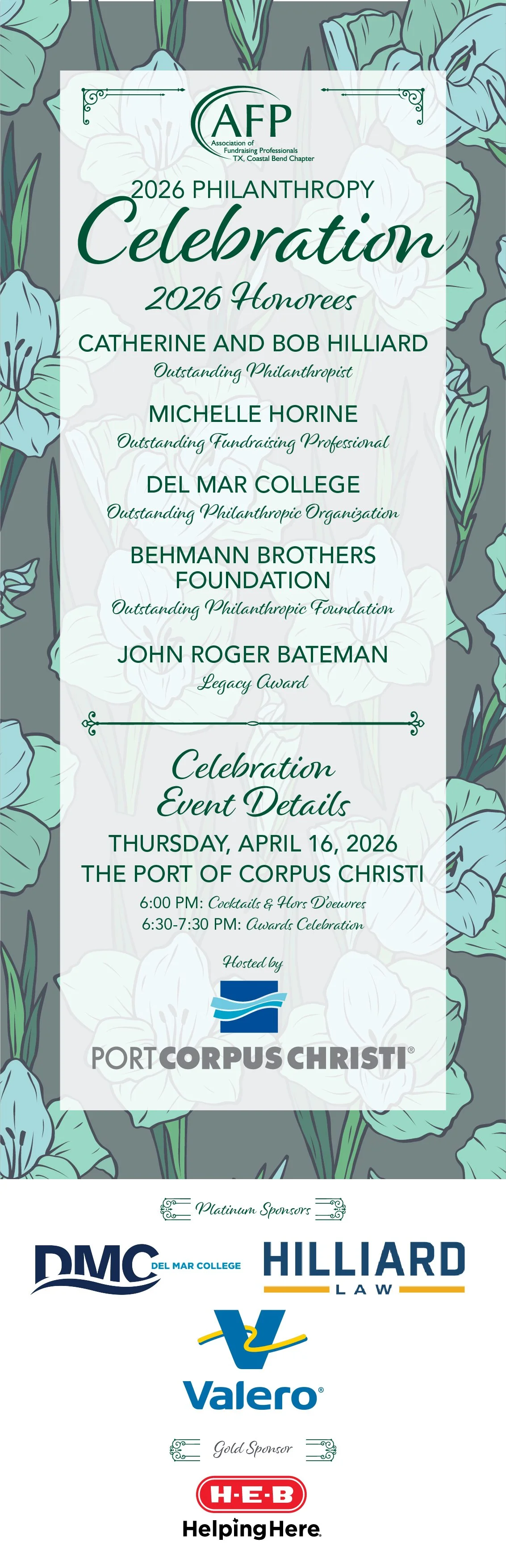 Association of Fundraising Professionals (AFP) TX Coastal Bend Chapter is proud to recognize the outstanding achievements by individual, corporate and organizational philanthropists, corporations, organizations, fundraising professionals and youth in philanthropy. These awards are given in recognition of lifetime or long-term achievements that have had a major impact on our community and beyond.